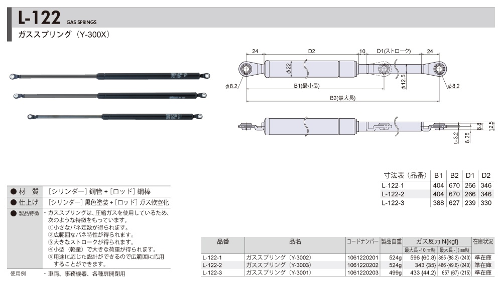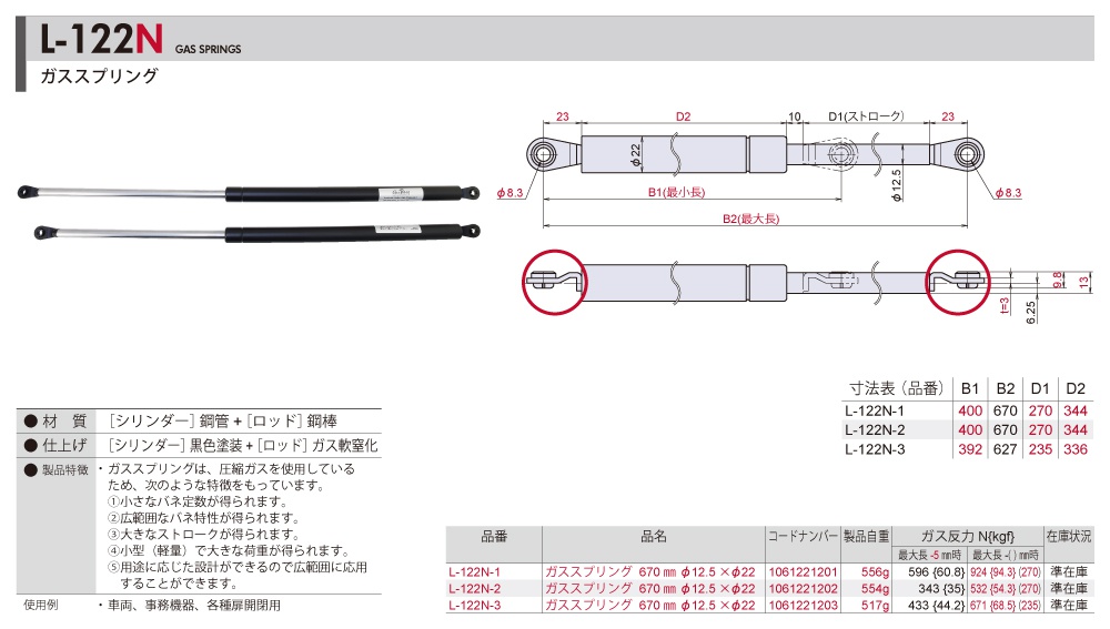 2019.12.18L-122→L-122N 仕様変更のお知らせ 「L-122」が仕様変更したため、「L-122N」へと品番が変更となりました。 変更点は赤文字の部分となります。詳細はお問い合わせ下さい。 ※ご使用中の機器設備の蓋・扉の重量によっては、取付位置の調整が必要になる場合がございます。 お問い合わせはこちら 新仕様:L-122N 旧仕様:L-122(総合カタログVol.H-02 p.495掲載品)