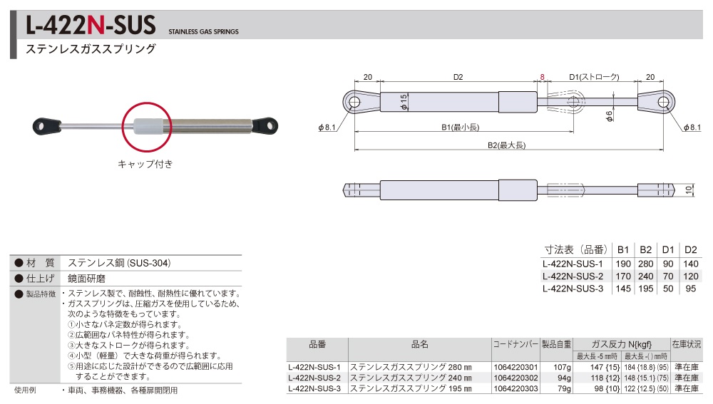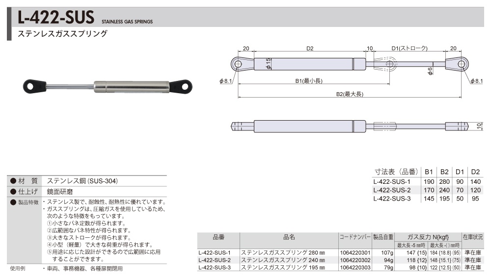 2019.12.18L-422-SUS→L-422N-SUS 仕様変更のお知らせ 「L-422-SUS」が仕様変更したため、「L-422N-SUS」へと品番が変更となりました。 変更点は赤文字の部分となります。詳細はお問い合わせ下さい。 ※仕様変更後も取付寸法等に変更はございません。 お問い合わせはこちら 新仕様:L-422N-SUS 旧仕様:L-422-SUS(総合カタログVol.H-02 p.496掲載品)