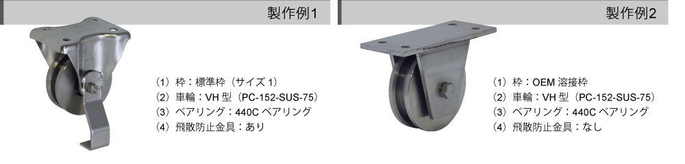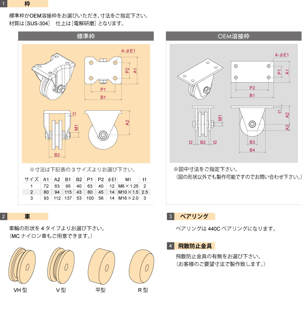 特注ステンレス戸車の製作の際には、下記要領に従い『1.枠の選定』『2.車の選定』『3.ベアリング』『4.飛散防止金具の選定』各パーツの選定をしていただきます。