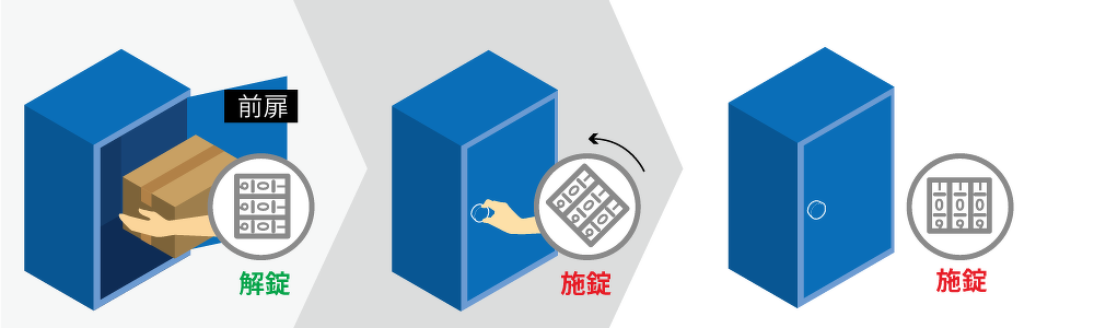 前入れ後ろ出しの宅配ボックスは、後扉から荷物を取り出した後、次回使用するために、前扉を解錠しておく必要があります。