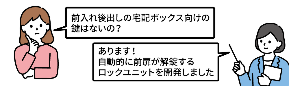 しかし、そのお悩みを解決する機械式の連動型ロックユニットを新開発しました!荷物を受け取り後、前扉が自動で解錠する画期的なロックユニットです。