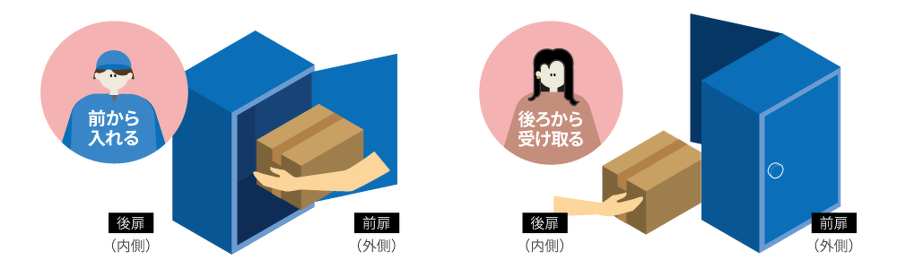 宅配業者は荷物を前の扉から入れ、受取人は後ろの扉から取り出すタイプの宅配ボックスを指します。