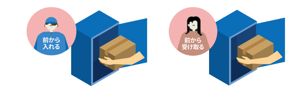 荷物を宅配業者が入れる場合、受取人が取り出す場合、どちらも前から同じ扉を使用するタイプの宅配ボックスを指します。