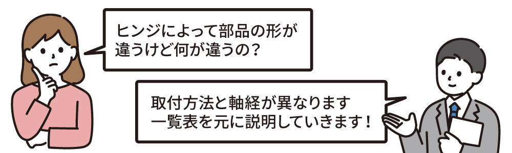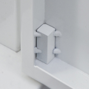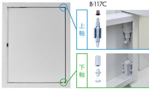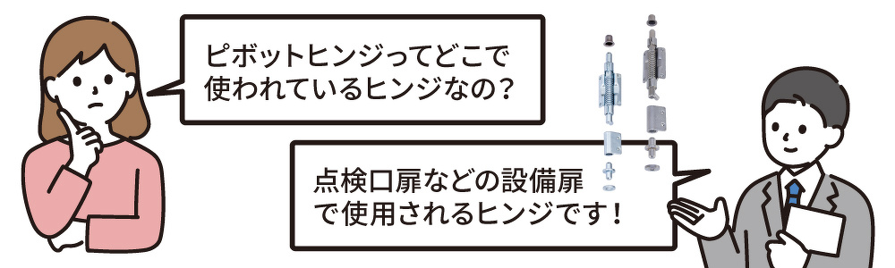 扉の内側に取り付けるため、表面からはヒンジが見えないすっきりとした見た目に仕上がります。そのため扉を目立たせたくない点検口扉などの設備扉に使用されています。また、扉を簡単に脱着することができるのが特徴です。