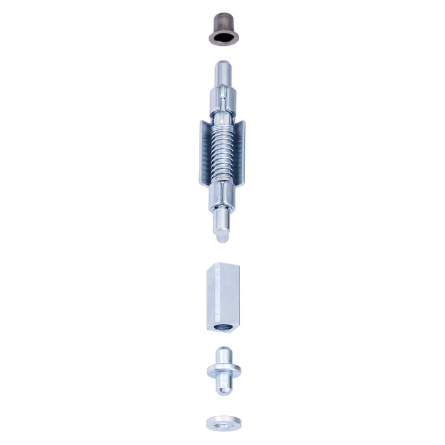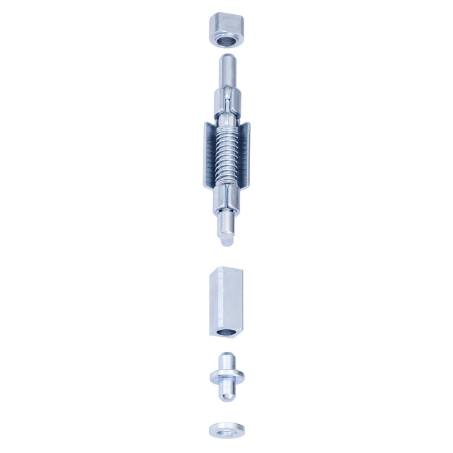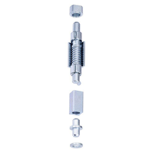 5.軸(ツマミ部)を引っ張り突起を中央に戻すと、スプリングの力で軸が出た状態に戻ります。軸が枠側の穴へ嵌れば吊り込み完了です。