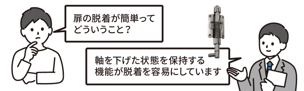 4.軸を下げた状態を保持できるので、施工時に両手が使え、扉の吊り込みがスムーズに行えます。養生の際も簡単です。