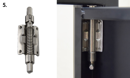 ピボットヒンジは上下の「軸」を抜き差しすることで扉の脱着を行います。軸を抜く際、軸を下げた位置を保持するので、両手を使って扉の脱着が行えます。また、一般的な蝶番とは異なり、ビスを何本も外す必要がなく、工具不要で脱着が可能です。