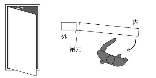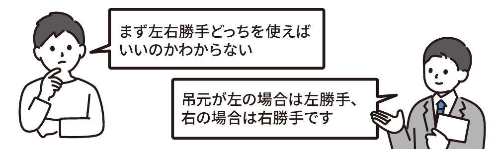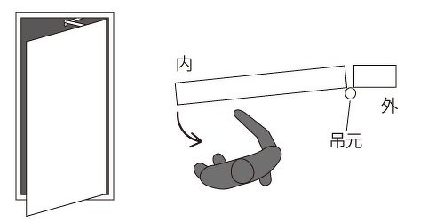 扉を手前に引いたとき、吊元(蝶番)が左側にある場合は左勝手を、吊元(蝶番)が右側にある場合は右勝手をご使用ください。