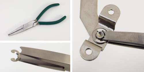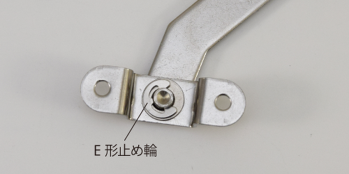 1.座金を固定している「E形止め輪」を外します。取り外しには専用のプライヤーをご使用ください。