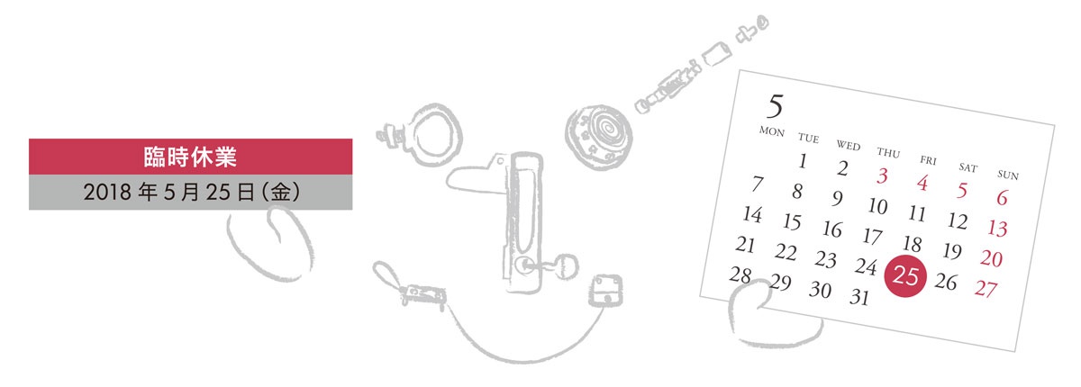 2018.05.07【重要】臨時休業のお知らせ 平素は格別のお引き立てをいただき、厚く御礼申し上げます。 さて、勝手ながら弊社では社内行事のため、下記のとおり臨時休業とさせていただきます。 ご迷惑をおかけ致しますが、宜しくお願いいたします。 臨時休業 : 5月25(金)