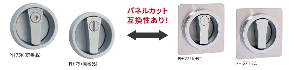 2020.12.14PH-75K/PH-75(廃番品)とパネルカットに互換性あり! 「PH-271K-EC/PH-271-EC」を新たに追加いたしました。 「PH-75K/PH-75(廃番)」とパネルカットに互換性があるため、扉の再製作なしでハンドル取り換えが可能となりました。 ■紹介製品 ※画像をクリックすると詳細へ飛びます。 【製品図】PH-271K-EC (※PH-271-ECは下記図面の鍵穴がない仕様となります。) ←製品についてのお問い合わせはこちら