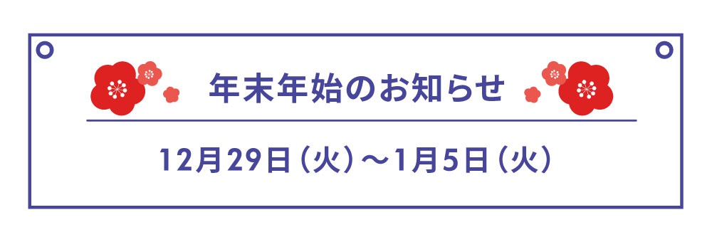2020.12.11年末年始のお知らせ 年末年始のお知らせ 平素は格別のお引き立てをいただき、厚くお礼申し上げます。 弊社の年末年始の休業日は以下の通りとさせていただきます。 ●休業期間:2020年12月29日(火)~2021年1月5日(火) 尚、お問い合わせに関しましては、1月6日(水)以降の対応となりますので、宜しくお願い申し上げます。