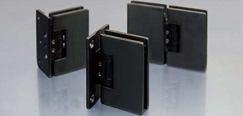 人気定番商品の「黒」シリーズが標準品に鏡面やヘアライン仕上げが一般的なガラス扉用ヒンジをマットブラックに。