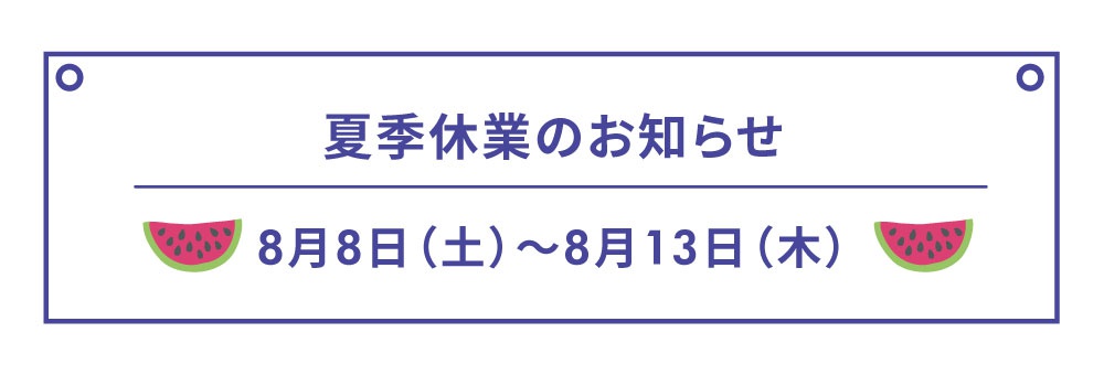 2020.07.27夏季休業のお知らせ 平素は格別のお引き立てをいただき、厚くお礼申し上げます。 さて、弊社では下記のとおり夏季休業させていただきます。期間中はご迷惑をお掛けいたしますが宜しくお願い致します。 休業日:2020年8月8日(土)~2020年8月13日(木) 8月14日(金)より平常営業致します。