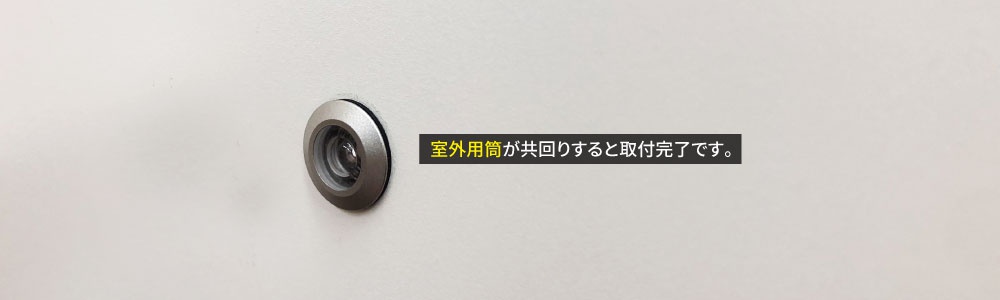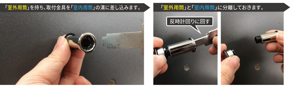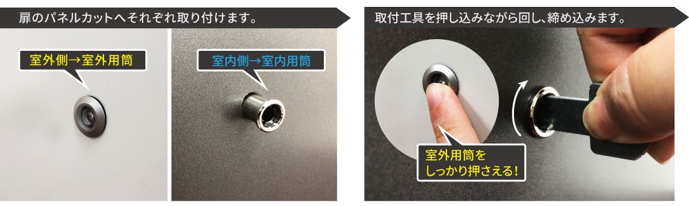室外筒は室外側に、室内筒は室内側に、それぞれ扉のパネルカットに差し込み、取付工具で締め込みます。
