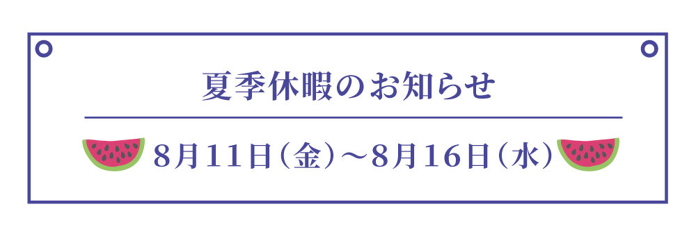 2023.07.18夏季休暇のお知らせ いつもジョー・プリンス竹下をご愛顧いただき、誠にありがとうございます。 さて、勝手ながら弊社では、下記のとおり休業させていただきます。ご迷惑をお掛けいたしますが宜しくお願い致します。 夏期休暇:8月11日(金)~16日(水)