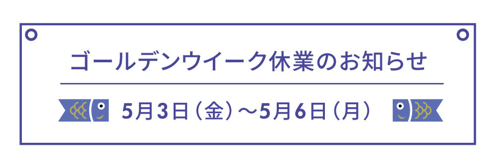 2024.04.16ゴールデンウィーク休業のお知らせ 平素は格別のお引き立てをいただき、厚くお礼申し上げます。 さて、弊社では下記のとおり休業させていただきます。期間中はご迷惑をお掛けいたしますが宜しくお願い致します。 休業日:2024年5月3日(金)~2024年5月6日(月)