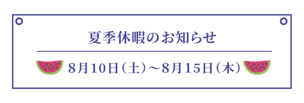 2024.07.18夏季休暇のお知らせ 猛暑の候、貴社ますますご盛栄のこととお喜び申し上げます。平素は格別のお引き立てをいただき、厚く御礼申し上げます。 さて、勝手ながら弊社では、下記のとおり休業させていただきます。 ご迷惑をお掛けいたしますが宜しくお願い致します。 夏期休暇:8月10日(土)~15日(木)