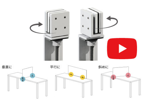 パネル板を挟む部分が360°回転することで、取り付け角度を調整することが出来ます。