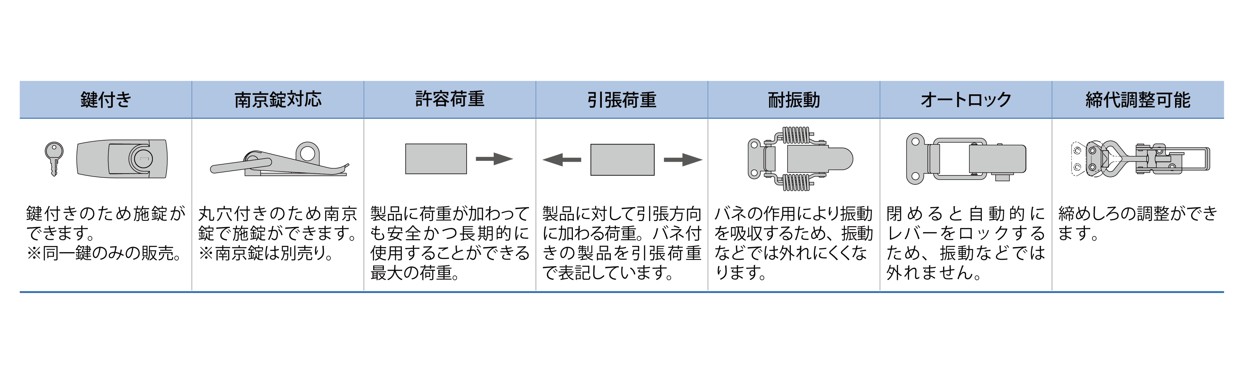 パッチン錠を種類、機能別にまとめた表を作成しました。下記ボタンからご覧いただけます。